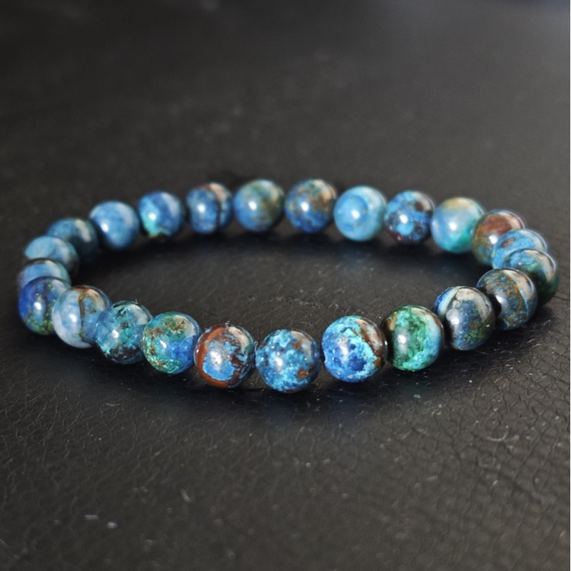 Ritkán kapható rizokolla karkötő, melyben a gyöngyök mérete kb 8 mm. Ezek az eredeti krizokolla szemek nem összekeverendők az ásványpiacon gyakran megjelenő festett, műgyanta gyöngyökkel. Náunk eredeti ásványt kapsz.
