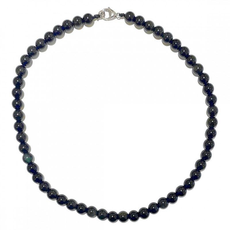 Az obszidián szemek fény alatt jellegzetesen itt - ott csillognak. A nyaklánc mérete kb 40cm, de egyedi méretben is rendelhető.